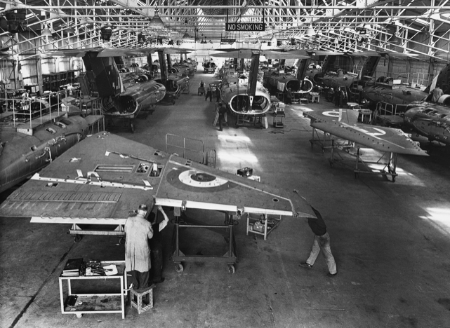 The Gloster Javelin assembly line at Gloster Aircraft Co’s factory near Gloucester, 1960